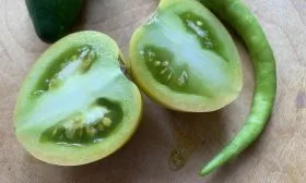 Именно здесь этот сорт проявляет свою самую яркую и запоминающуюся особенность, которая резко выделяет его на фоне других. Согласно техническим характеристикам, цвет зрелого плода — зеленый с прожилками желтого цвета. Это не опечатка. В биологической спелости плоды не краснеют, а приобретают очень красивую, экзотическую окраску.