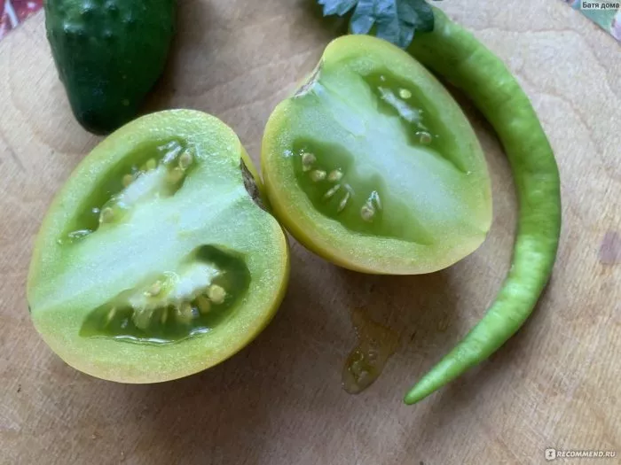 Именно здесь этот сорт проявляет свою самую яркую и запоминающуюся особенность, которая резко выделяет его на фоне других. Согласно техническим характеристикам, цвет зрелого плода — зеленый с прожилками желтого цвета. Это не опечатка. В биологической спелости плоды не краснеют, а приобретают очень красивую, экзотическую окраску.