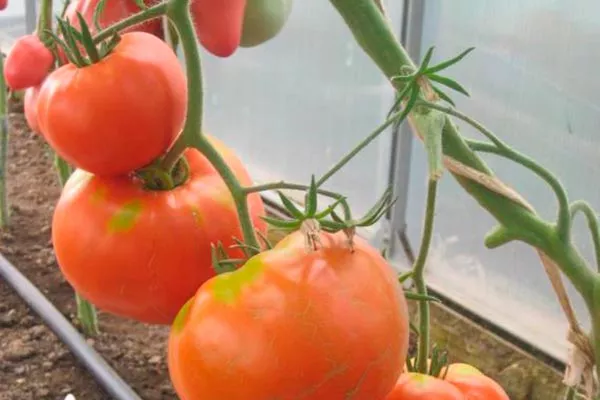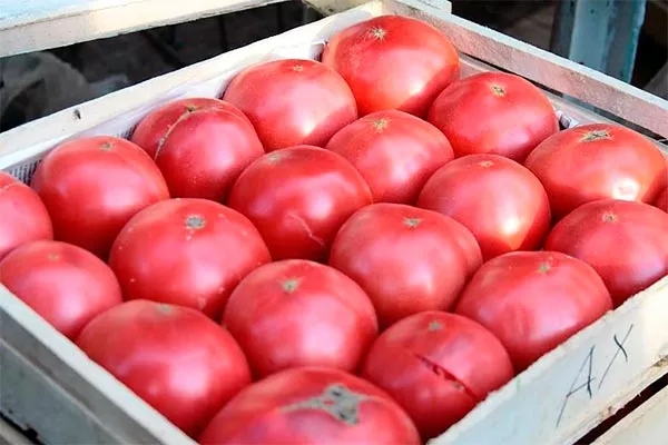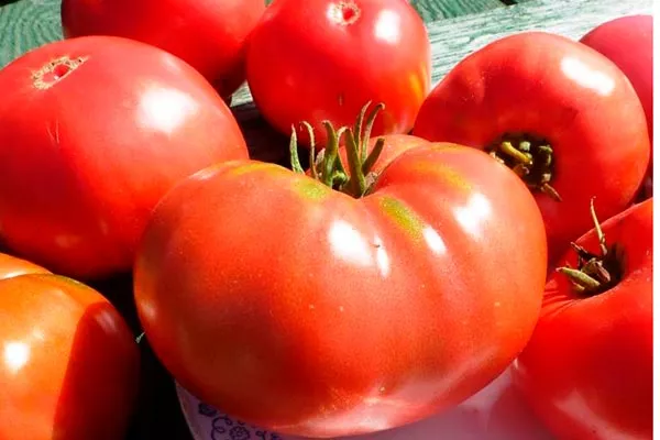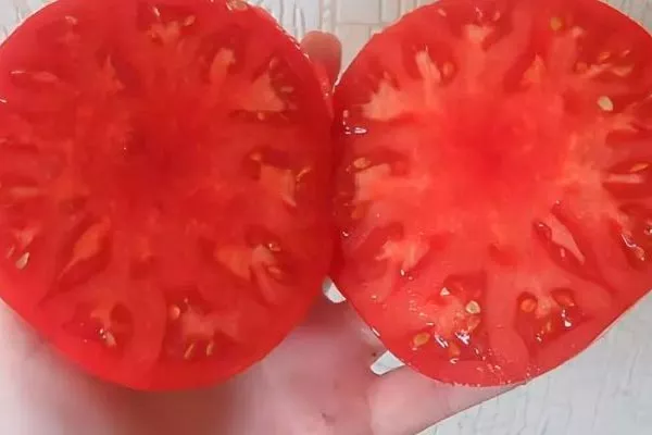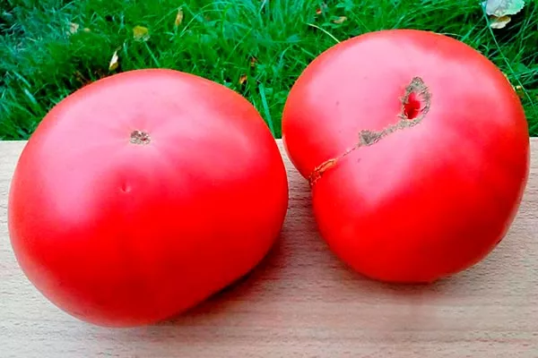 - В стадии зрелости томаты приобретают малиново-красный цвет. Кожура тонкая и склонна к растрескиванию при избытке влаги. Вес помидоров варьируется от 400 до 600 г, встречаются экземпляры массой до 1000 г.