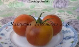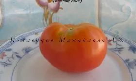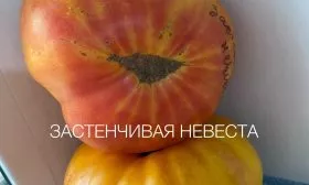 Поэтичное название сорта «Застенчивая невеста» точно отражает динамику окрашивания его плодов. Созревание не происходит одномоментно. Изначально плоды приобретают теплый оранжевый оттенок, который постепенно, будто смущаясь, сменяется нарастающим красным румянцем. Итоговый цвет зрелого томата описывается как оранжево-красный — сложный, двухтонный, что делает плоды необычайно декоративными.