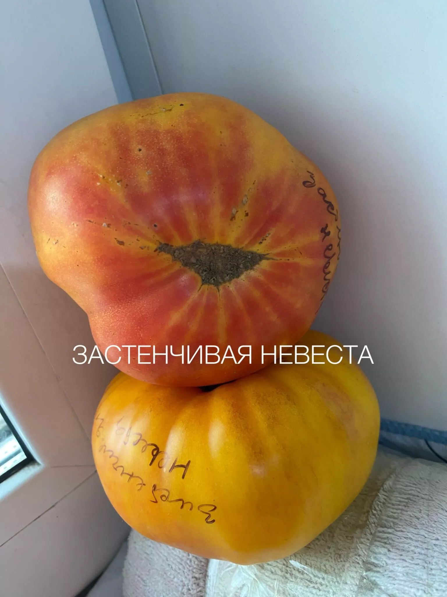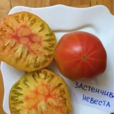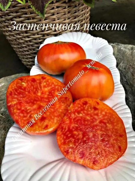 Поэтичное название сорта «Застенчивая невеста» точно отражает динамику окрашивания его плодов. Созревание не происходит одномоментно. Изначально плоды приобретают теплый оранжевый оттенок, который постепенно, будто смущаясь, сменяется нарастающим красным румянцем. Итоговый цвет зрелого томата описывается как оранжево-красный — сложный, двухтонный, что делает плоды необычайно декоративными.