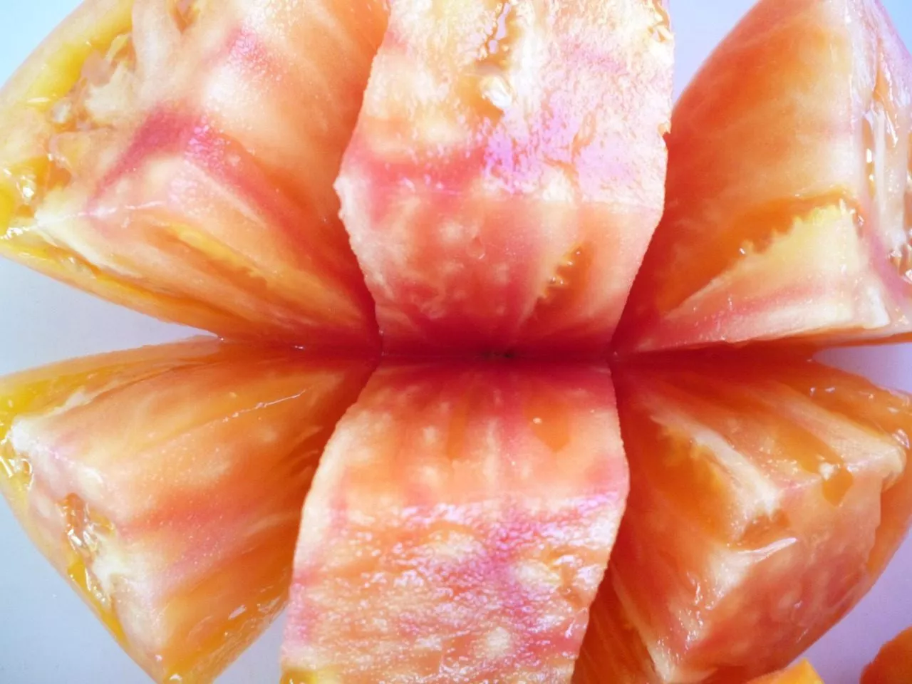 Далее начинается удивительная метаморфоза: от плодоножки постепенно распространяется насыщенный красный румянец. Полностью созревший плод приобретает заявленный в характеристиках оранжево-красный окрас, где пропорции этих двух цветов на каждом отдельном томате могут быть разными. Это создает эффект живописного градиента — от ярко-красного «плечика» до солнечно-оранжевого основания.