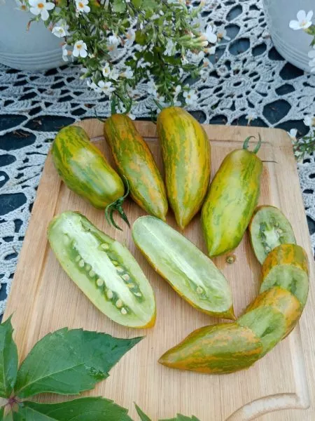 Изумрудный цвет зрелого плода с перламутровыми полосками — не просто декоративная особенность. Он указывает на высокое содержание хлорофилла и, возможно, других пигментов, что может влиять на антиоксидантный профиль плода. В свежих салатах, нарезках и бутербродах такие помидоры выполняют роль яркого акцента, визуально обогащая блюдо.