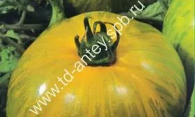 Главная отличительная черта этого сорта — его уникальная окраска. Основной фон зрелого плода остается зеленым, но его покрывают яркие, контрастные желтые полосы, идущие от плодоножки к вершине. Согласно техническим характеристикам, эти полосы могут покраснеть при полном созревании, что добавляет плодам декоративности. Незрелый томат имеет однородную светло-зеленую окраску без рисунка.