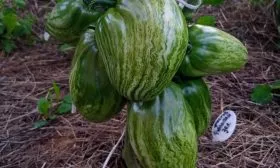 Основная сложность заключается в визуальной оценке. В технической спелости плоды имеют равномерный зеленый окрас. Полная зрелость наступает, когда на изумрудно-зеленом фоне проявляются яркие малиновые и оранжевые разводы и полоски, указанные в характеристиках сорта.