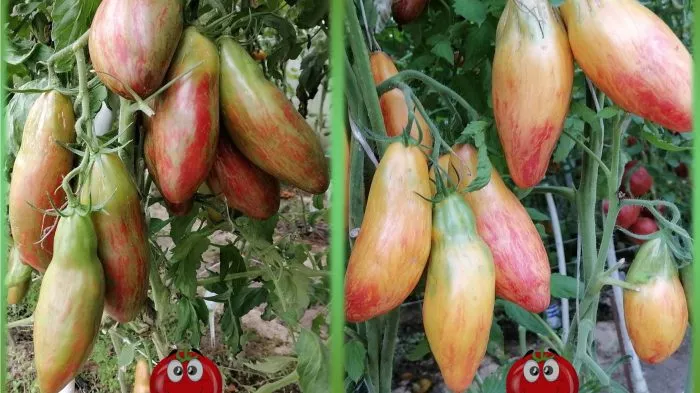 Истинная декоративность сорта раскрывается при созревании плодов. Их форма не является строго однородной, что добавляет сорту особого шарма. На одном и том же растении могут формироваться как удлиненные, банановидные помидоры, так и более округлые, напоминающие пухлые крупные сливы.