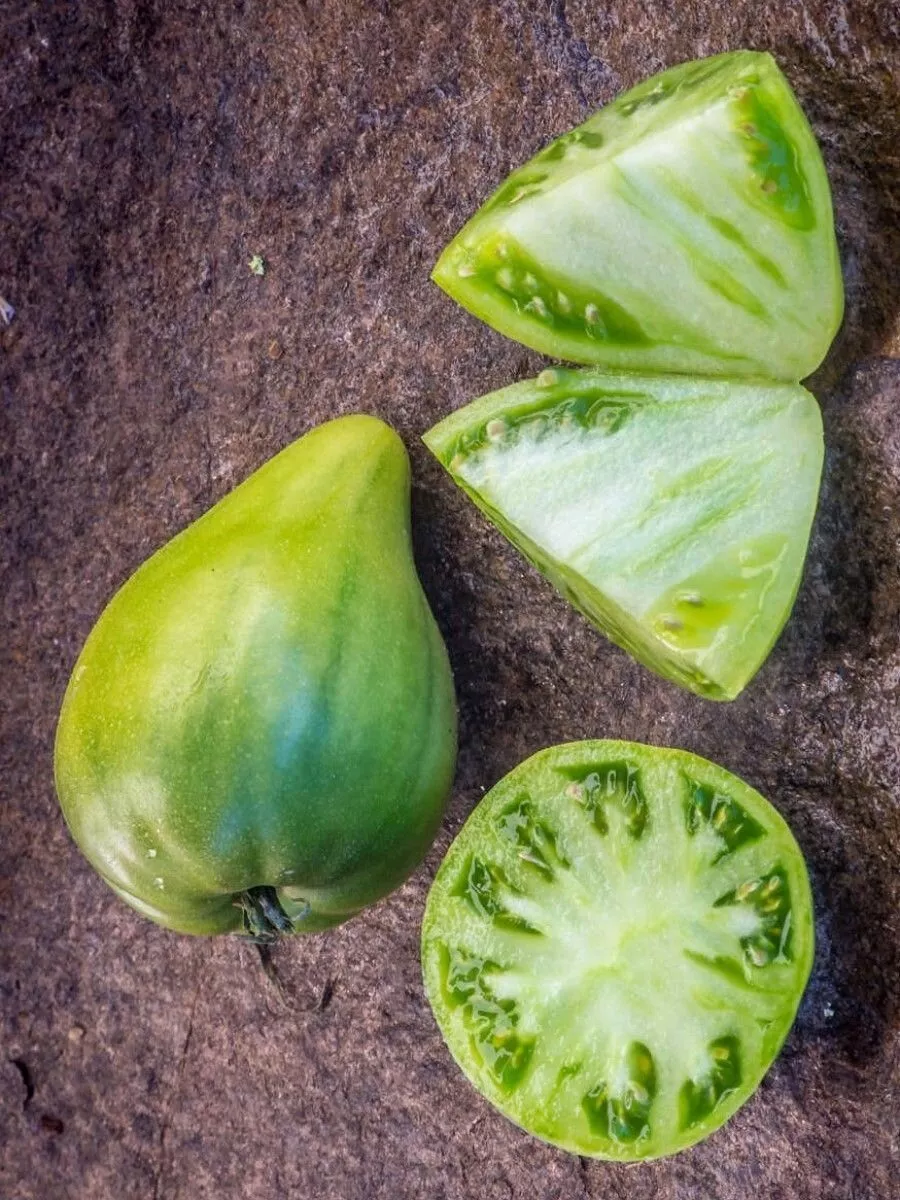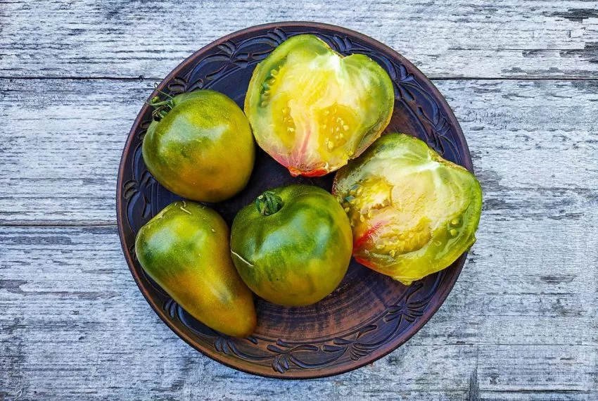 Плоды имеют классическую сердцевидную форму с выраженными, иногда ребристыми «плечиками». Их главная отличительная черта — уникальный окрас в биологической спелости: основной фон остается насыщенным зеленым с изумрудным оттенком, а на вершине проявляется розово-малиновый румянец.