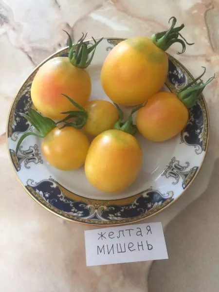 Главная отличительная черта плодов — их уникальная окраска. Основной насыщенный желтый цвет контрастирует с выраженным розовым пятном у плодоножки, что и дало сорту название «Мишень». Плоды округлые, массой около 80 граммов, с тонкой, но плотной кожицей.