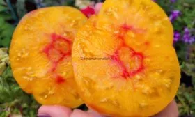 Мякоть очень плотная, мясистая и сахаристая на изломе. Количество семенных камер большое, но сами семян мало. При разрезе сок не вытекает свободно — мякоть сохраняет форму, что характерно для лучших биф-томатов. Именно такая структура, с высоким содержанием сухих веществ и сахаров, обеспечивает знаменитый сладкий вкус с едва уловимой или почти отсутствующей кислинкой.