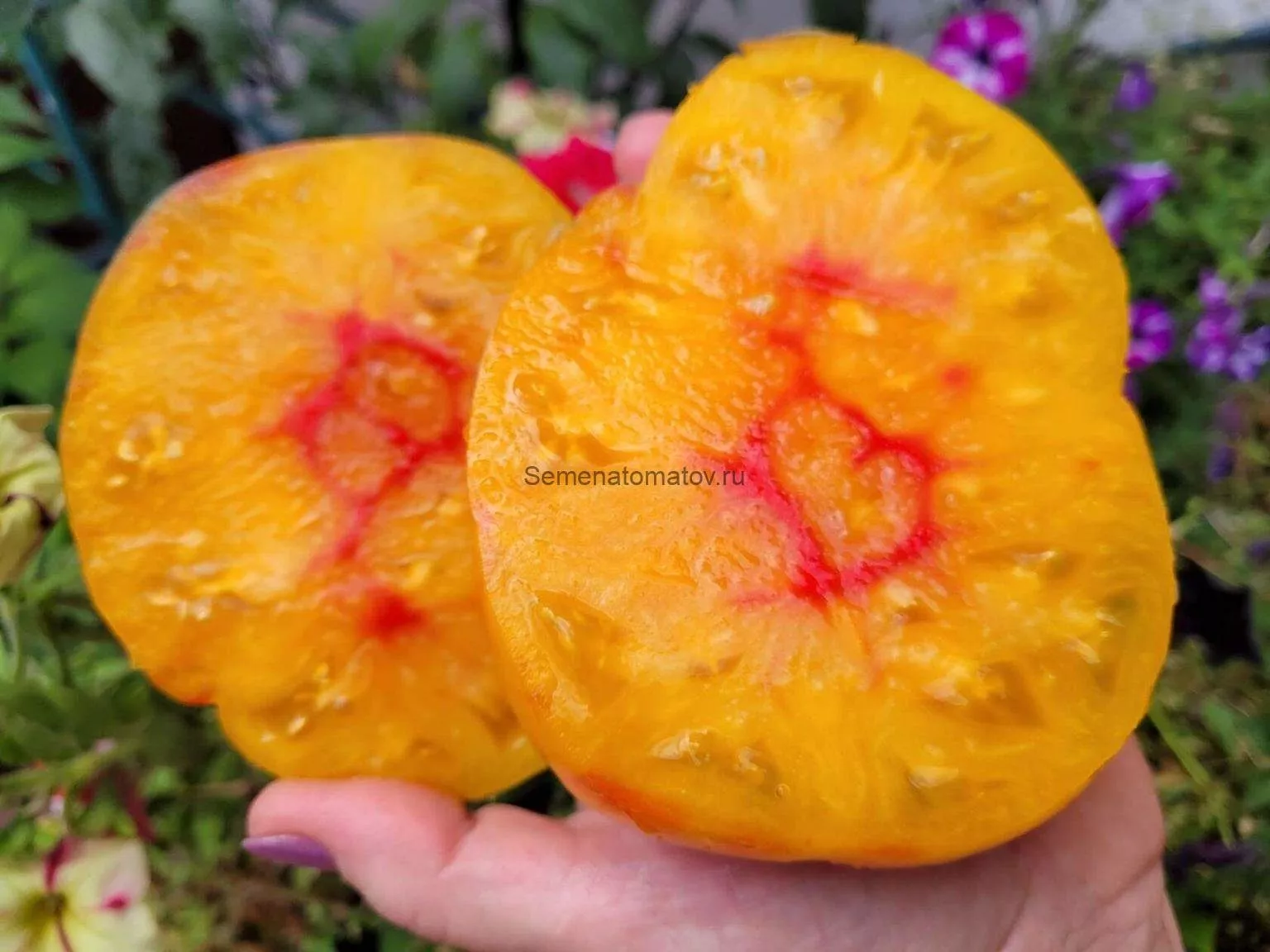 Мякоть очень плотная, мясистая и сахаристая на изломе. Количество семенных камер большое, но сами семян мало. При разрезе сок не вытекает свободно — мякоть сохраняет форму, что характерно для лучших биф-томатов. Именно такая структура, с высоким содержанием сухих веществ и сахаров, обеспечивает знаменитый сладкий вкус с едва уловимой или почти отсутствующей кислинкой.
