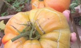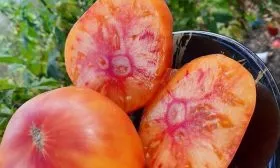 Мякоть очень плотная, мясистая (с малым количеством семян и сока), что характерно для биф-томатов. На разрезе видна та же уникальная мраморная окраска: желтая мякоть с розово-красными секторами. Плоды многокамерные. Кожица тонкая, но для такого крупноплодного сорта достаточно прочная, чтобы удерживать содержимое. Однако при резких перепадах влажности почвы или перезревании на кусте она может растрескиваться.
