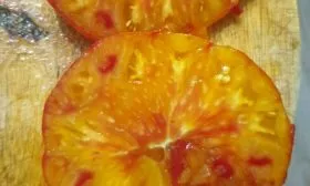 Присутствие красных прожилок свидетельствует о наличии ликопина, другого мощного антиоксиданта, характерного для красноплодных томатов. Таким образом, сорт может предлагать комбинацию полезных пигментов: бета-каротина в основной массе мякоти и ликопина в ее окрашенных частях.