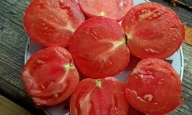 Масса плодов значительная, обычно в диапазоне 200-250 граммов. Плоды в нижних кистях, как правило, крупнее. Мякоть мясистая, многокамерная, с гармоничным балансом плотности и сочности. Такое сочетание эстетических и товарных качеств — равномерный окрас, выровненная форма, крупный размер и плотность — делает урожай этого сорта особенно привлекательным.