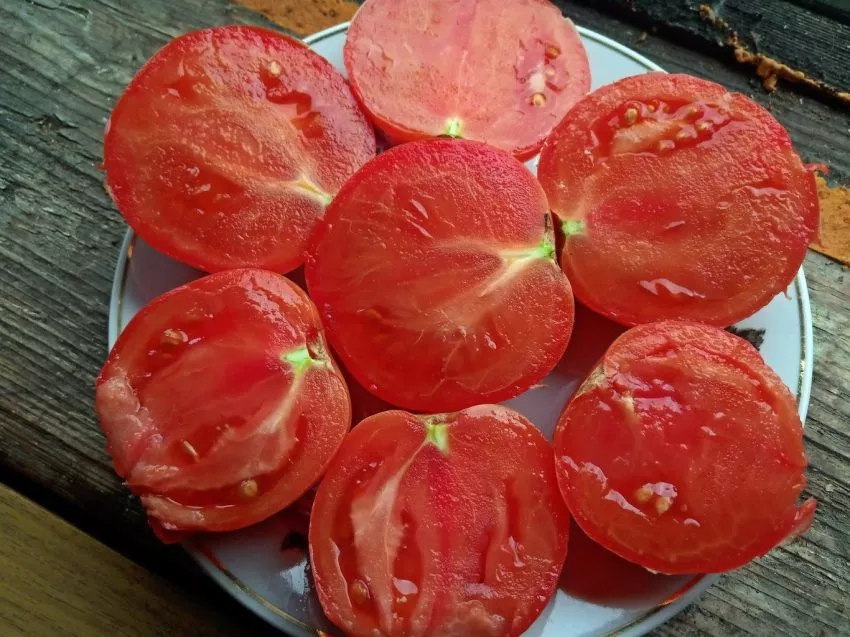 Масса плодов значительная, обычно в диапазоне 200-250 граммов. Плоды в нижних кистях, как правило, крупнее. Мякоть мясистая, многокамерная, с гармоничным балансом плотности и сочности. Такое сочетание эстетических и товарных качеств — равномерный окрас, выровненная форма, крупный размер и плотность — делает урожай этого сорта особенно привлекательным.
