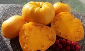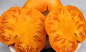 В стадии полной биологической спелости плоды приобретают привлекательный желто-оранжевый окрас. Такой цвет обусловлен высоким содержанием каротиноидов, в частности бета-каротина. Мякоть очень плотная, мясистая (так называемого биф-типа), многокамерная, с небольшим количеством семян.