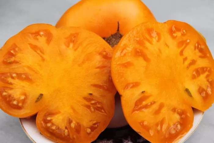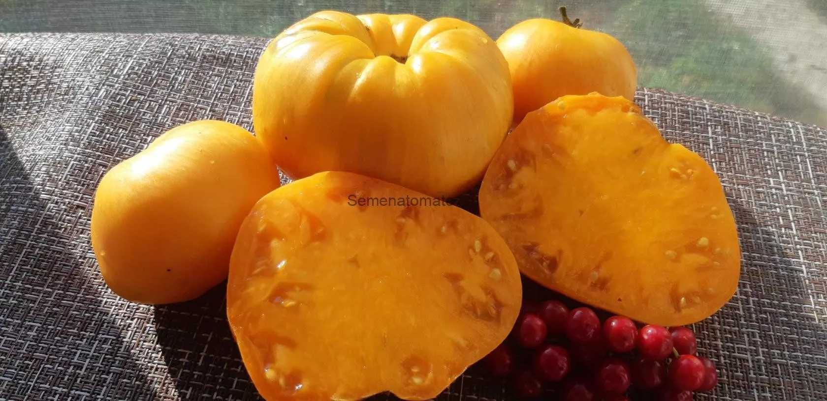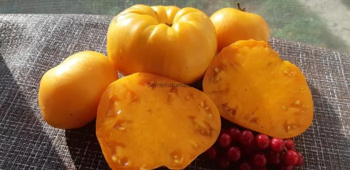 В стадии полной биологической спелости плоды приобретают привлекательный желто-оранжевый окрас. Такой цвет обусловлен высоким содержанием каротиноидов, в частности бета-каротина. Мякоть очень плотная, мясистая (так называемого биф-типа), многокамерная, с небольшим количеством семян.