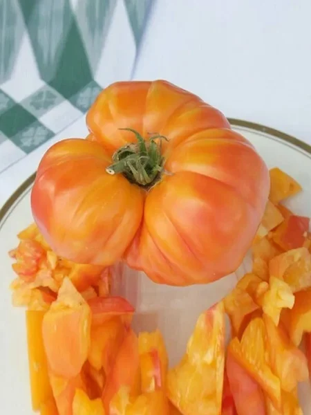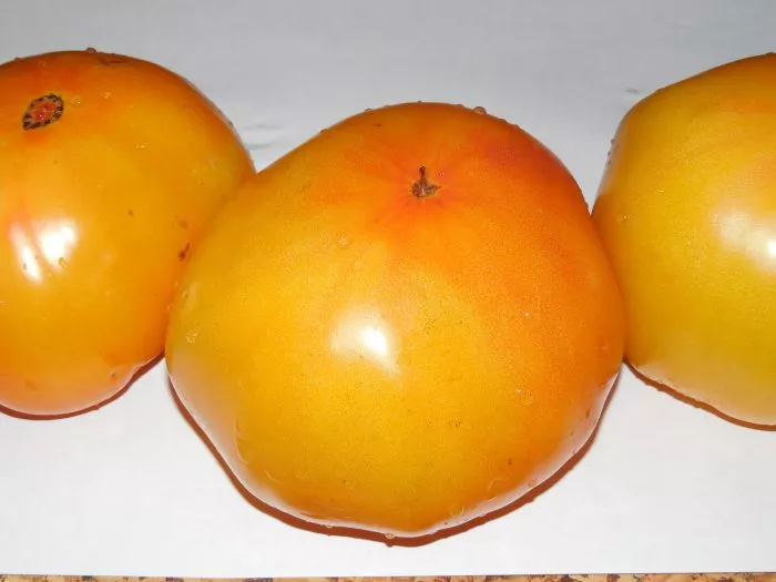 В состоянии полной биологической спелости основной фон плода, особенно в верхней части у плодоножки, имеет насыщенный оранжево-желтый или золотистый оттенок. К нижней части, к вершине, этот цвет плавно переходит в малиново-красный или теплый розовый румянец. Граница между оттенками часто размыта, создавая красивые персиковые и абрикосовые переливы. Рисунок у каждого томата индивидуален, поэтому найти два абсолютно одинаковых плода практически невозможно.