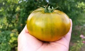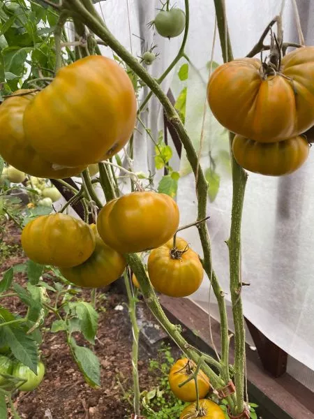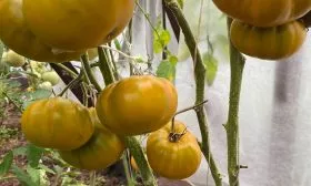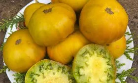 | Исключительный, сладковатый с тропическими нотками вкус. | Требователен к формированию и подвязке из-за высокого роста и тяжелых плодов. | Цвет в полной зрелости — тускло-золотистый, иногда с легким зеленоватым румянцем у плодоножки. |
