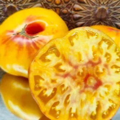 В технической спелости плоды имеют зеленую окраску с характерным темным пятном у плодоножки. По мере созревания основной фон наливается теплым, солнечно-оранжевым цветом. По этому фону проступают размытые, нечеткие полосы малиново-красного оттенка, как указано в характеристиках сорта. Такой рисунок часто сравнивают с мраморными разводами или языками пламени, и он редко бывает одинаковым на двух разных плодах.