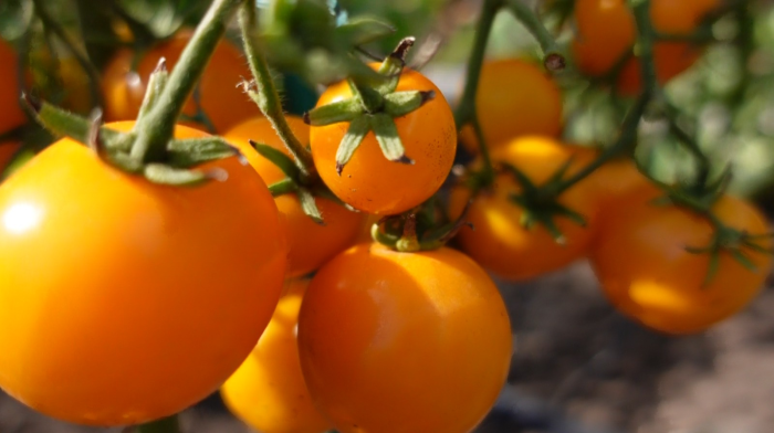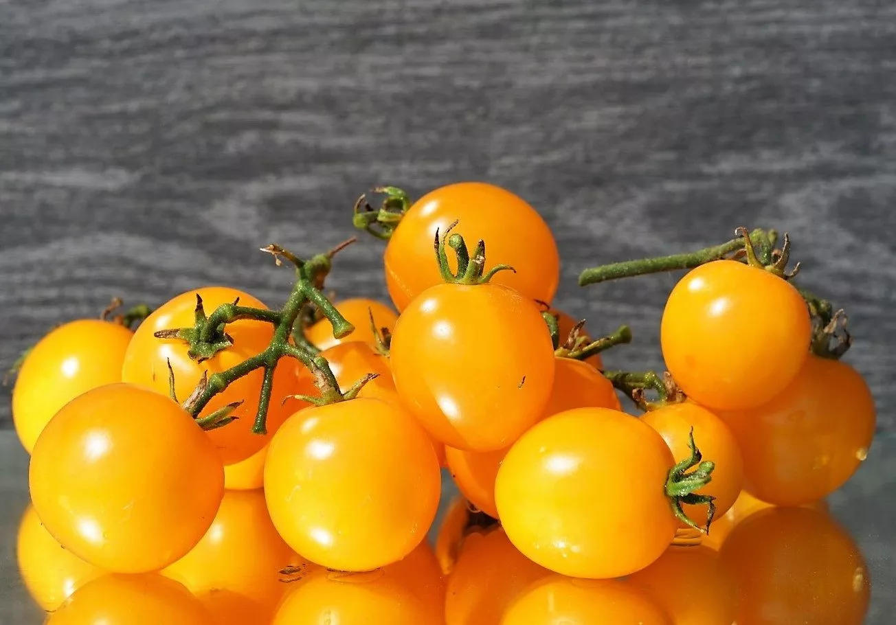 Окраска в полной зрелости – равномерный, насыщенный желто-оранжевый цвет без зеленого пятна у плодоножки. Плоды собраны в нарядные простые кисти, обычно по 6-8 штук. Вкусовая палитра гармонична: доминирует сладость, которая уравновешивается легкой, освежающей кислинкой. Мякоть мясистая, сочная, с высоким содержанием сахаров и бета-каротина, что и определяет ее питательную ценность и яркий цвет.