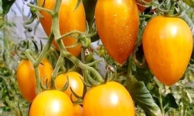 По мере полного созревания происходит характерное для данного сорта превращение: антоциановые полоски постепенно исчезают, а общий цвет плода равномерно переходит в теплый, солнечный золотисто-оранжевый. Форма плодов округло-овальная, классическая «сливка». Такая вытянутая форма с плотной мякотью и малым количеством семенных камер идеально подходит для цельноплодного консервирования, так как томаты сохраняют структуру в маринаде. Средняя масса одного плода достигает заявленных 50 граммов.