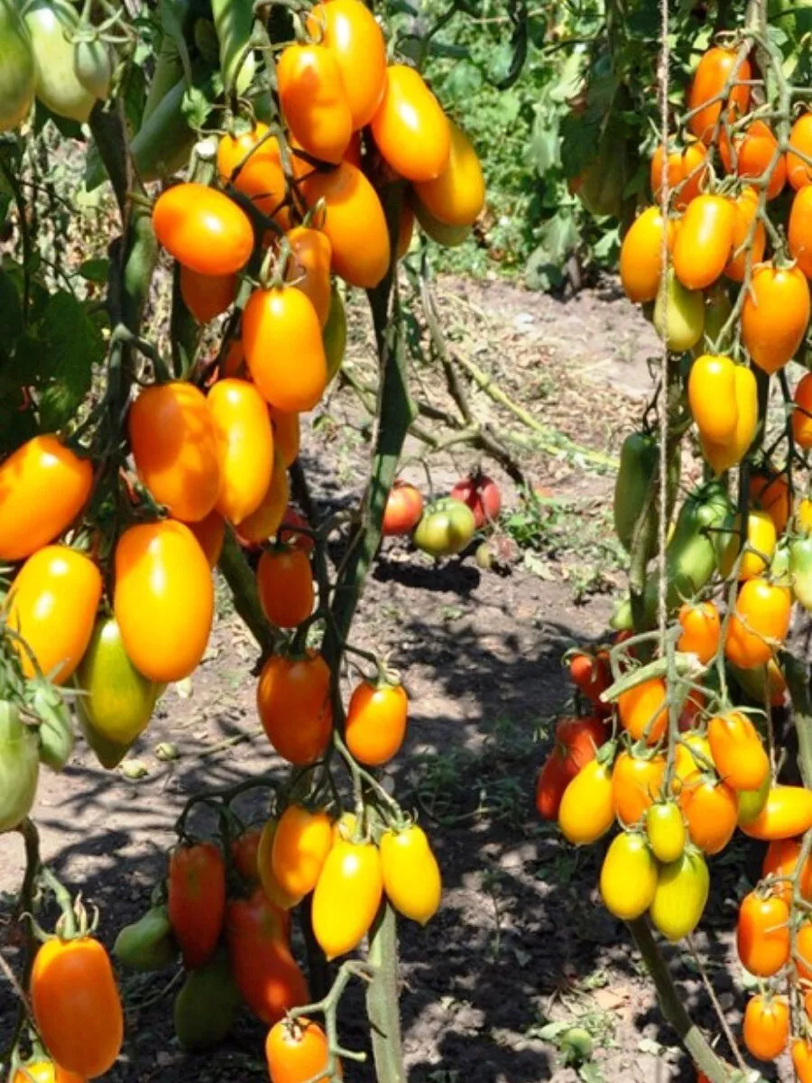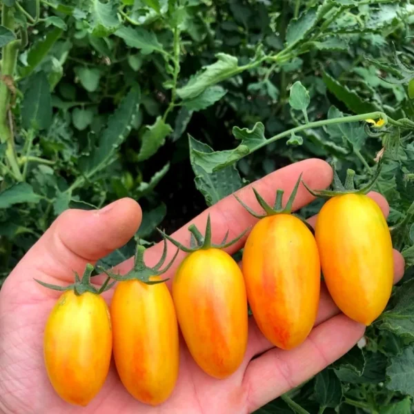 По мере полного созревания происходит характерное для данного сорта превращение: антоциановые полоски постепенно исчезают, а общий цвет плода равномерно переходит в теплый, солнечный золотисто-оранжевый. Форма плодов округло-овальная, классическая «сливка». Такая вытянутая форма с плотной мякотью и малым количеством семенных камер идеально подходит для цельноплодного консервирования, так как томаты сохраняют структуру в маринаде. Средняя масса одного плода достигает заявленных 50 граммов.