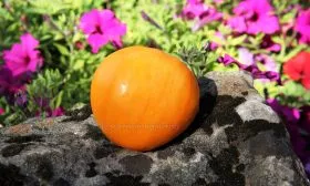 Истинное чудо сорта раскрывается при созревании плодов. Помидоры округлой, иногда слегка приплюснутой формы, с выраженной ребристостью у плодоножки. Их цвет в полной зрелости — теплый, солнечный желто-оранжевый, без зеленых пятен.