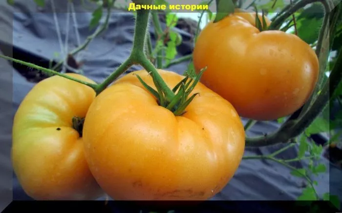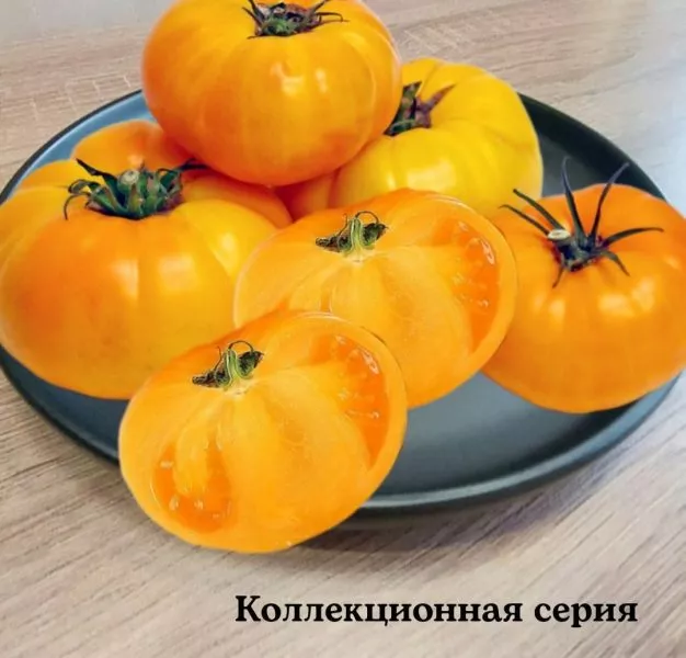 Истинное чудо сорта раскрывается при созревании плодов. Помидоры округлой, иногда слегка приплюснутой формы, с выраженной ребристостью у плодоножки. Их цвет в полной зрелости — теплый, солнечный желто-оранжевый, без зеленых пятен.