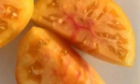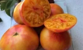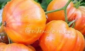 Кожица у плодов плотная, но не грубая, что предохраняет их от растрескивания при грамотном поливе. Мякоть многокамерная, мясистая, с высоким содержанием сухих веществ и малым количеством семян, что характерно для многих биф-томатов (крупноплодных сортов).