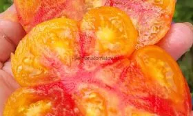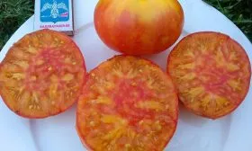 В менее освещенных частях кисти полосы могут быть бледнее или немногочисленнее. Эта вариабельность делает каждый томат уникальным. На разрезе мякоть часто неоднородна: желтая основа может быть пронизана красными прожилками, создавая эффект мраморности, что напрямую связано с описанной внешней окраской.