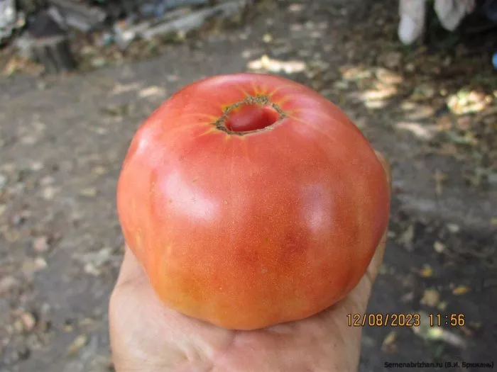 Плоды имеют типичную для крупноплодных томатов плоскоокруглую форму, часто с заметной ребристостью в области плодоножки. Эта ребристость – косвенный признак многокамерности и высокой мясистости, что коррелирует с заявленной массой до 400-500 граммов.
