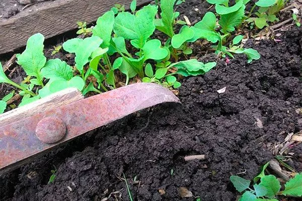 - Для улучшения аэрации почвы и предотвращения образования плотной корки, которая мешает доступу кислорода к корням, регулярно рыхлите междурядья. Своевременно удаляйте сорняки, которые могут конкурировать с редисом за влагу и питательные вещества.