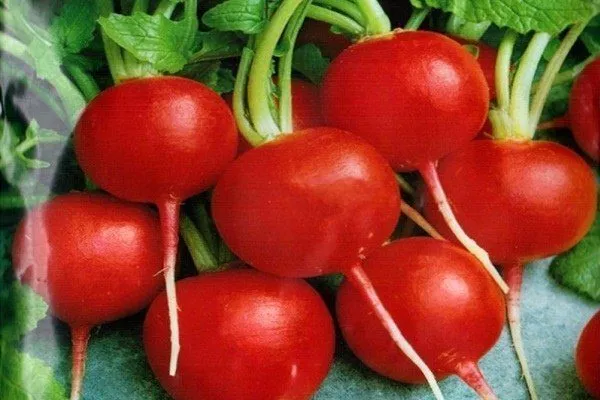 У редиса округлая конфигурация. Они вырастают крупными, достигая до 7 см в диаметре. Их масса варьируется от 95 до 100 г. Кожица ярко-красного цвета, а мякоть белая, плотная и сочная, без пустот и волокон.