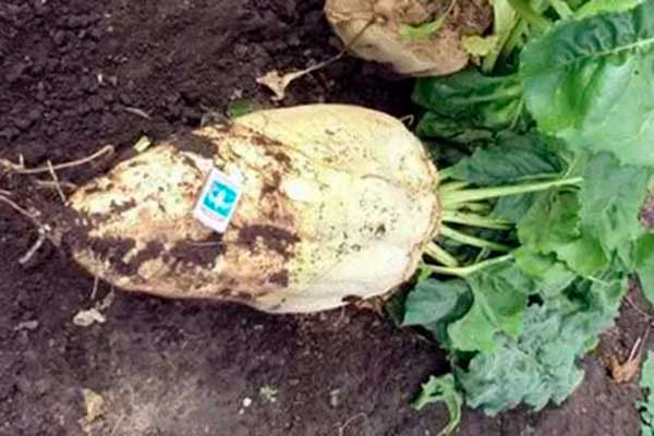 Корнеплод цилиндрической конфигурации с вытянутым концом, среднего размера, с бело-розовой окраской подземной части и едва зеленоватой надземной. Мякоть мясистая и сочная, белого цвета. Вес клубней варьируется от 428 до 469 г, но в чернозёме они могут вырастать до 10-15 кг, а иногда и до 25 кг.