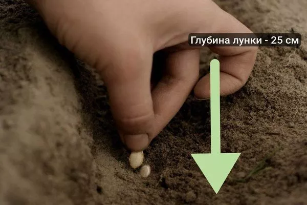 - В одну лунку кладут сразу 4-5 семечек. Семена засыпают грунтом. Глубина посадки должна составлять от 4 до 10 см. Чем легче грунт, тем глубже посадка.