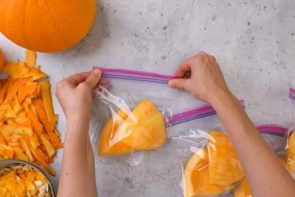 - Тыкву можно хранить в замороженном виде, порезав на куски и упаковав в полиэтиленовые пакеты. Срок хранения в морозилке — 8-10 месяцев.