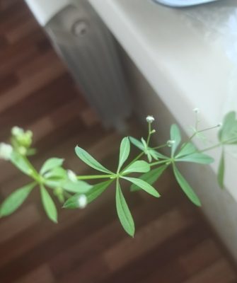 В этом году пыталась выращивать микрозель шпината. С последней посадкой вместе со шпинатом активно проросла вот такая вьющаяся зелень. Растет очень быстро, буквально заполняет все вокруг, кое где есть цветочки, на ощупь немного колючая, если заденешь одеждой, то цепляется к вещам. Что это такое? Сорняк? Или все же что-то декоративно полезное?