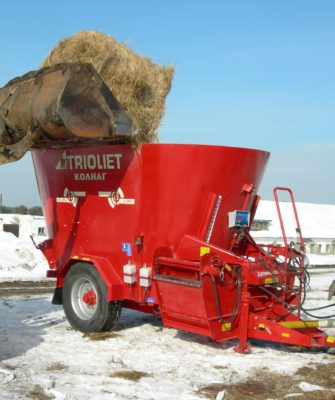Работаем на произведенном в Московской области (завод Колнаг) кормосмесителе Trioliet Solomix 12 (объем камеры смешивания 12 кубов). Вертикальная конструкция шнеков.