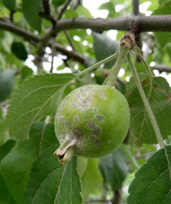 По-моему, это обычная парша. Она самая распространённая для яблонь. Пока не поздно, надо срочно спасать дерево. иначе потом начнётся поражение листвы и веток. А ещё позже плоды одеревенеют. Передаётся по воздуху, поэтому важно весной проводить опрыскивания для профилактики. Мы обычно используем сначала 3%-ый раствор бордоской жидкости (это до распускания почек). А когда появятся первые листья, то концентрацию этого раствора снижаем – хватает всего 1%. А сейчас вам нужно опрыскивать уже более сильными препаратами – Фитолавином, Хорусом, Фитоспорином-М или Гамаиром.