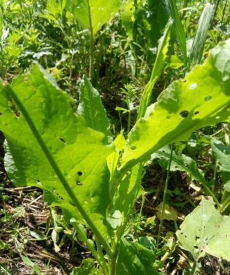 Мы сейчас находимся на даче и у нас есть вся необходимая зелень, кроме щавеля. Но мы нашли конский. Вот так он выглядит: