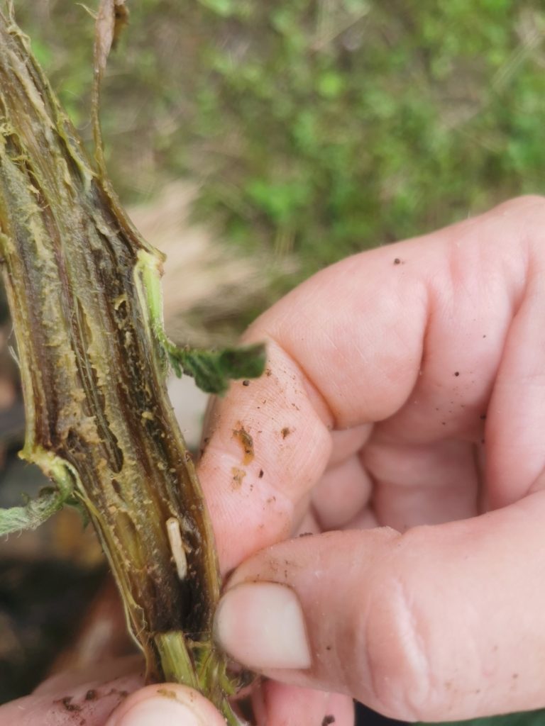 Да, это не нематода однозначно, потому что она поражает клубни и корни. Хотя есть, конечно, и стеблевая нематода, но она внутрь стебля не проникает. Скорее всего, это личинки картофельной моли. По крайней мере по внешнему виду и признакам очень соответствует. Личинки живут внутри стебля и питаются внутренним содержимым. Со временем стебли увядают.
